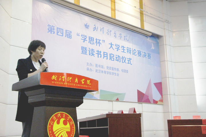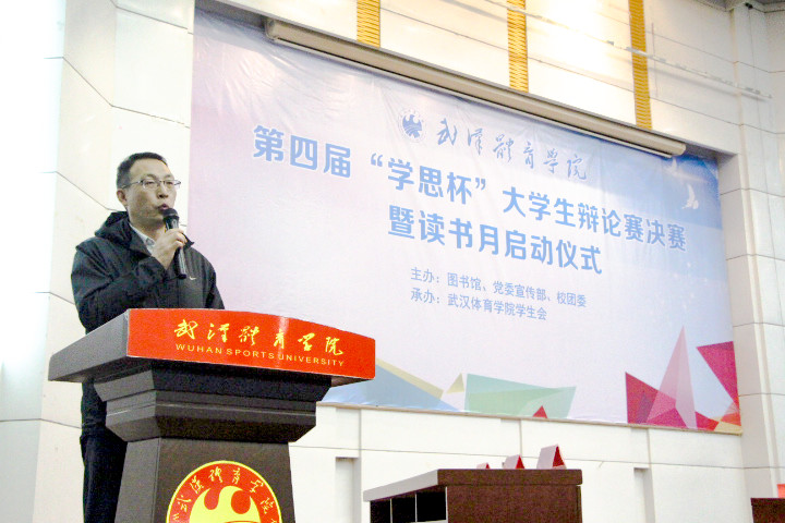 4月21日晚7点,由武汉体育学院图书馆、党委宣传部、校团委主办,校学生会承办的第五届读书月启动仪式暨“学思杯”大学生辩论赛决赛在东教学楼第三报告厅举行。副校长王志强致辞并宣布第五届读书月活动开幕。图书馆馆长代红霞主持开幕式。党委组织部部长王栎、机关党委书记刘丽艳、研究生院党委书记徐伟宏、校团委书记曹武平、图书馆副馆长窦志以及各学院分团委书记、学生代表400余人参加了活动。