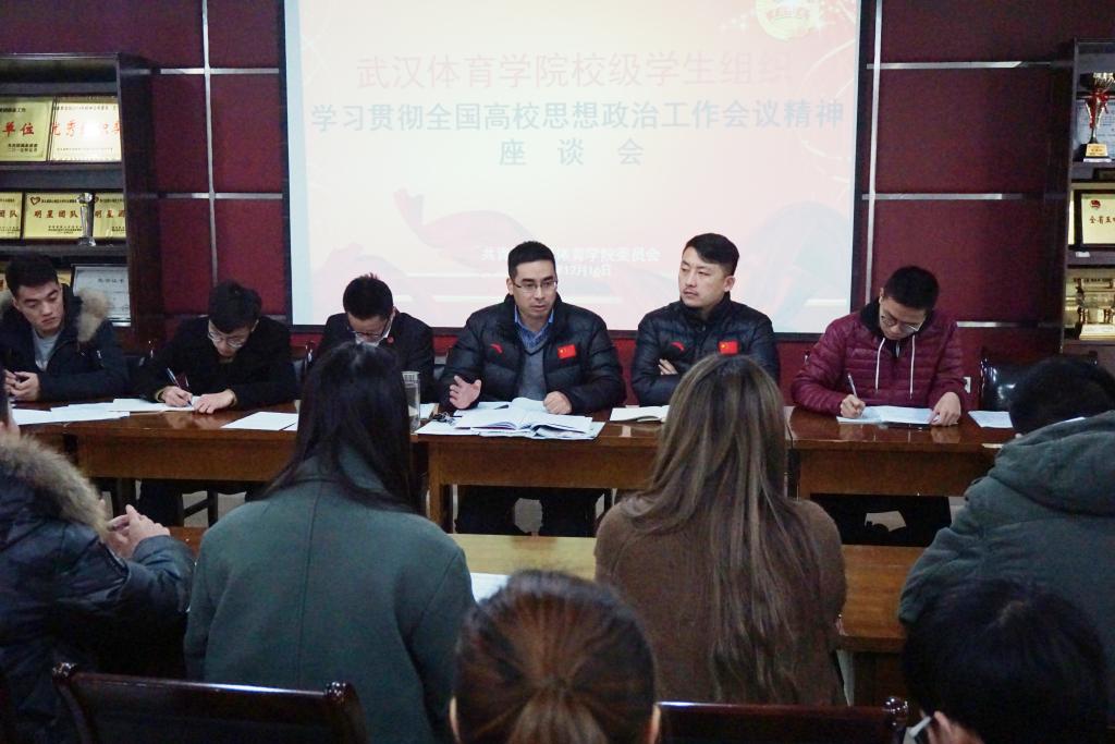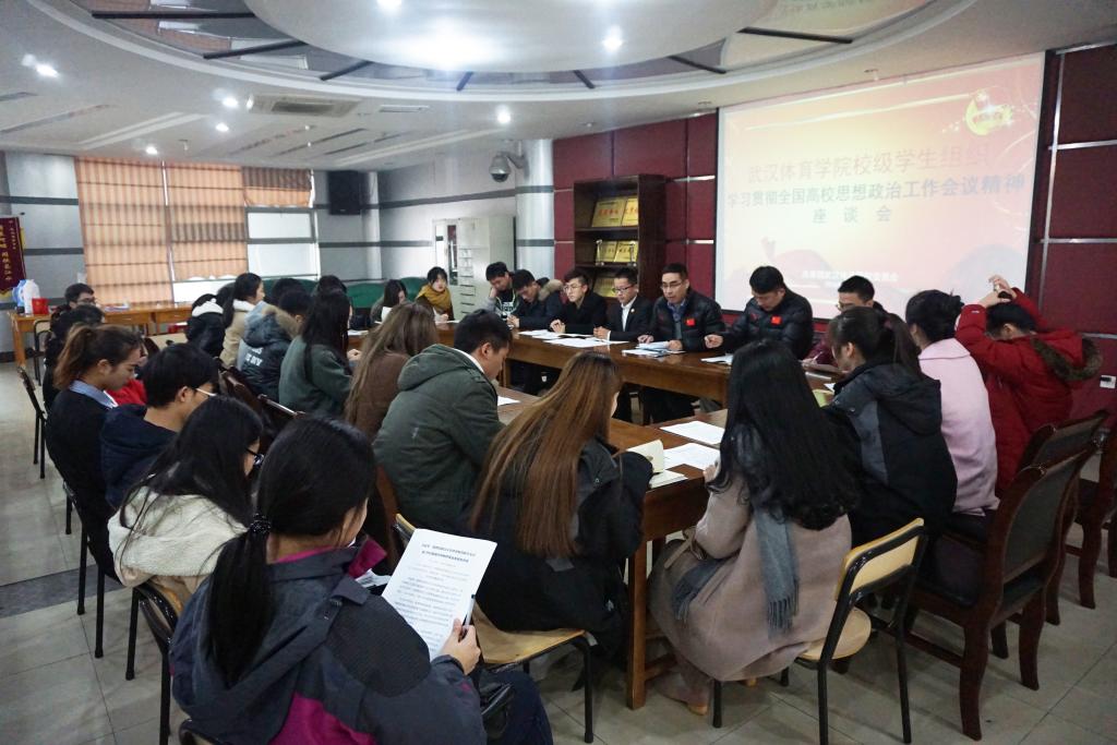 12月16日中午,学校校团委召开武汉体育学院校级学生组织主要干部学习宣传贯彻全国高校思想政治工作会议讲话精神座谈会。校团委书记曹武平,副书记李硕,校级学生组织主席团(主任团)成员、秘书处成员以及校学生会部长级干部参加集体学习研讨。