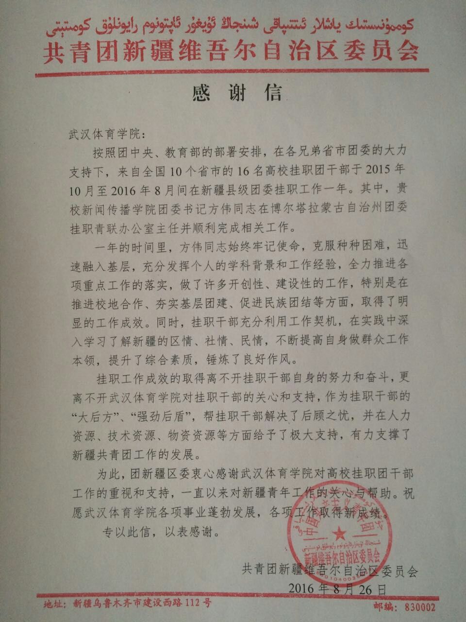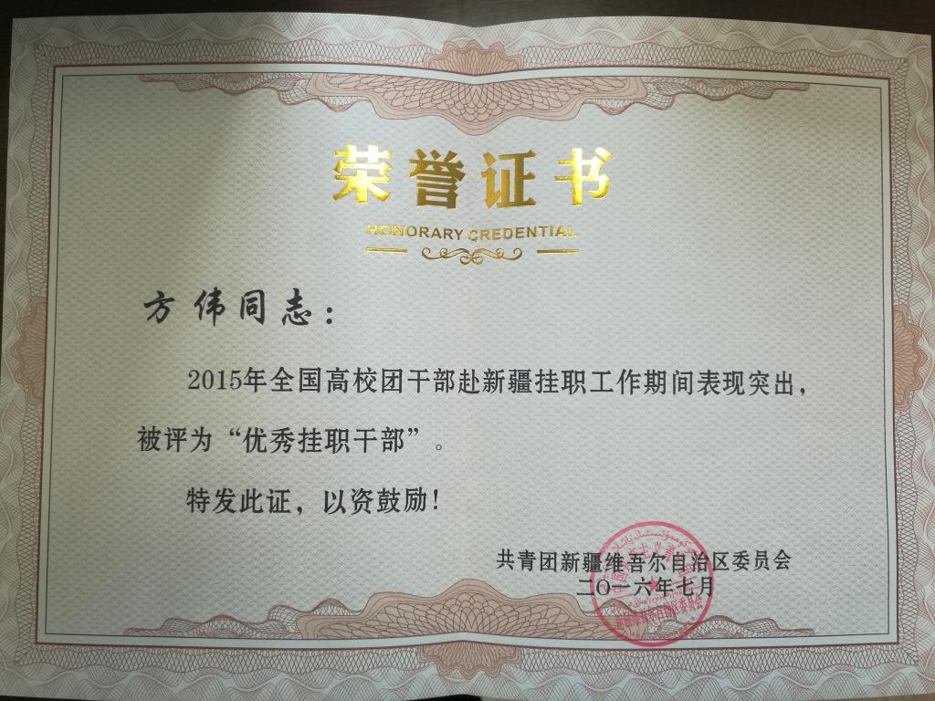 在近一年的挂职工作中,方伟同志勤奋敬业,受到了基层干部群众的一致好评,被共青团新疆维吾尔自治区委员会授予“优秀挂职干部”荣誉称号。共青团新疆维吾尔自治区委员会专门致信我校,感谢我校作为挂职干部的“大后方”、“强劲后盾”,解决挂职干部的后顾之忧,并在人力资源、技术资源、物资资源等方面有力支撑新疆共青团工作的发展。