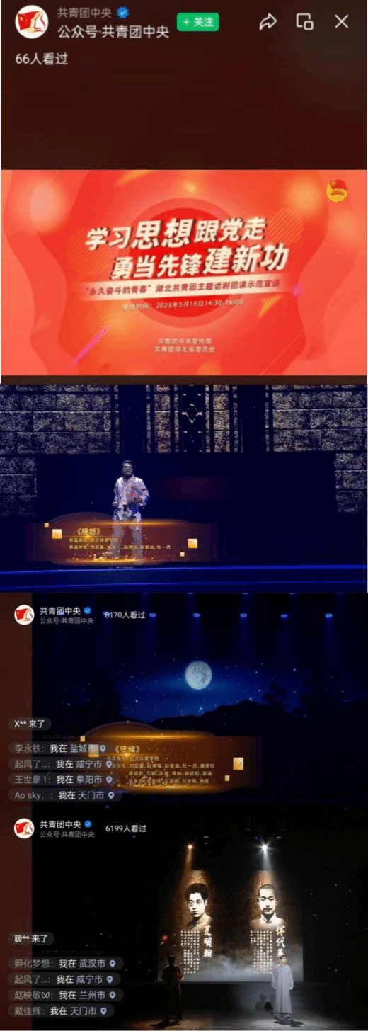 本次话剧团课示范宣讲通过湖北日报、湖北发布、长江云、新浪新闻、大楚网和“青春湖北”视频号、抖音、快手、B站等共18个平台同步直播。5月18日,团中央视频号播出“永久奋斗的青春”湖北共青团主题话剧团课示范宣讲。