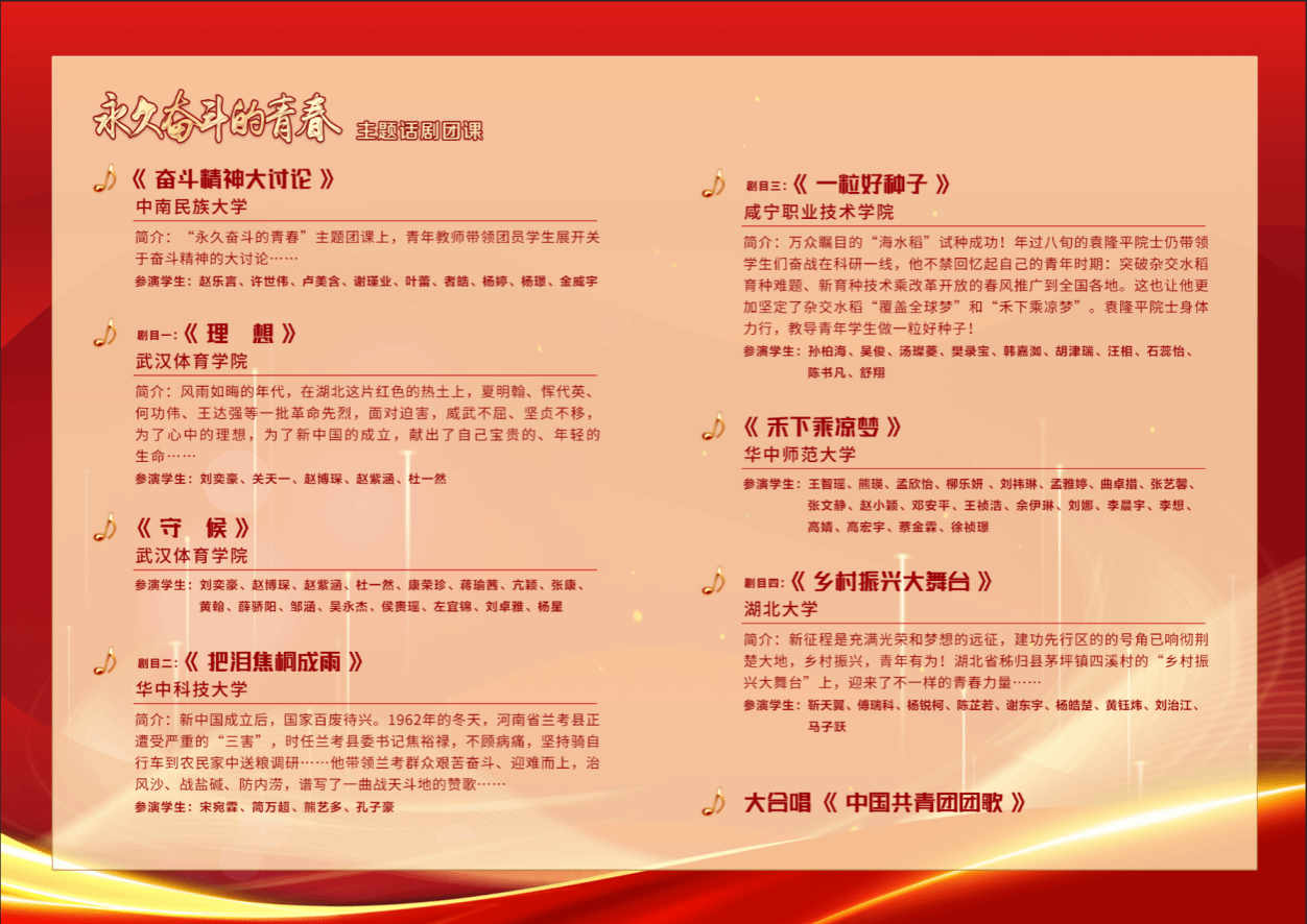据悉,我校参演学生将参与团省委“永久奋斗的青春”主题话剧团课巡讲,把青少年文艺精品送进校园、社区、农村等基层一线,引领广大青年为湖北建设全国构建新发展格局先行区贡献青春力量、展现青春担当!
