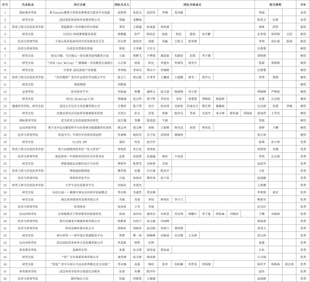 武汉体育学院第八届“挑战杯”大学生创业计划竞赛已圆满结束,共决出金奖两件,银奖三件,铜奖十三件,优秀奖二十件,现将本次比赛获奖作品的基本信息公示如下。