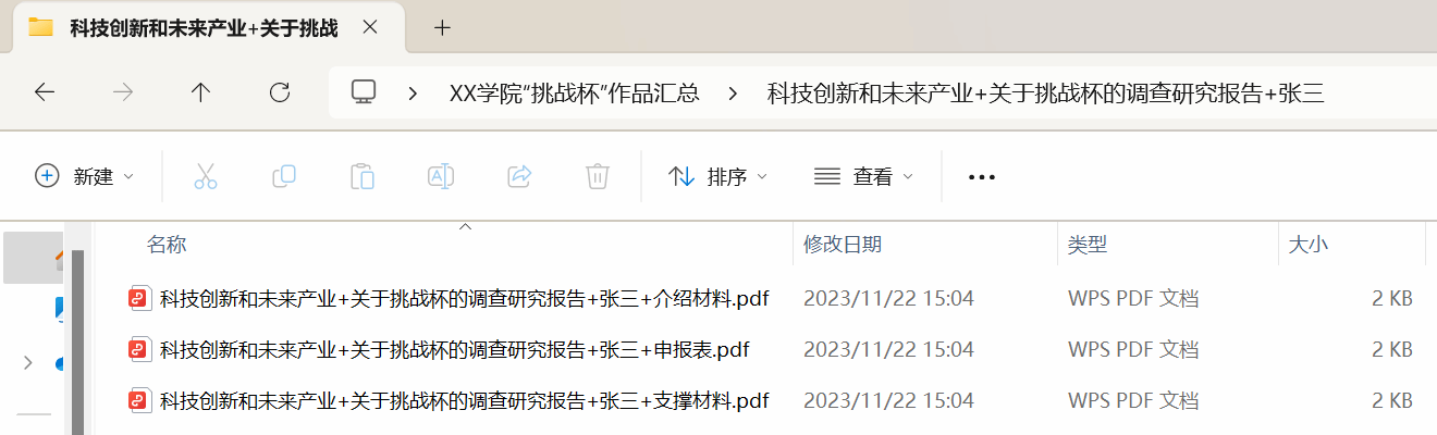 以上材料均提交PDF电子档,按要求整理后以“作品类别+作品名称+团队负责人+申报表/介绍材料/支撑材料”命名。(本轮材料收集不接收个人申报,必须由学院团委统一报送。前期已提交作品无论是否修改,均需在本轮作品收集中再次提交报送,如有新增作品也可报送。)