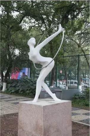 这一组由一位帅哥和两位秀丽女生共同托举五环的塑像在武体校友会楼前魏然不动,掩藏于青翠的高大树林和独具特色的行政楼之间,见证着一代又一代优秀的武体人离开这里,又回到这里的日日夜夜,这里沉淀的是武体人对母校的热爱和祝福,感恩教导,并期望武体能够将这份运动精神传承下去的美好愿景。